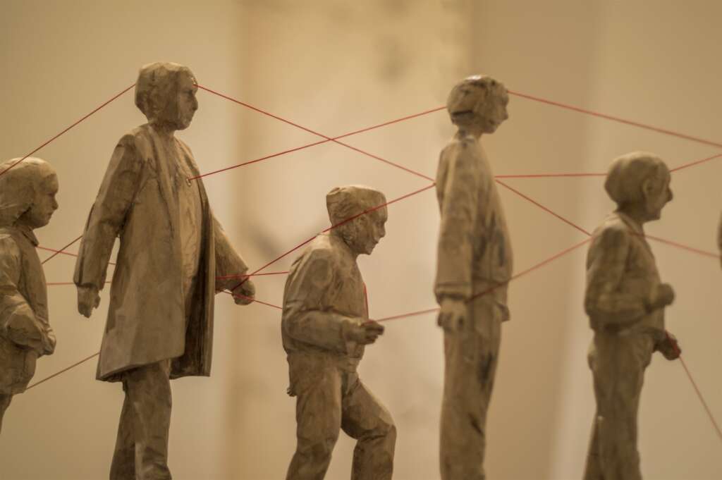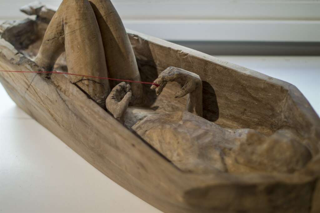 En la serie de esculturas en madera expuestas por Rosas se evidencia un disparador: el hilo rojo. A partir de allí las simbologías fluyen. “Sabía que iba a usar como recurso plástico el tema del hijo rojo, entonces me puse a desarrollar desde ahí: ¿Qué conecta el hijo rojo? ¿A quién conecta? ¿Cómo lo hace? Investigué algo de la mitología china, de la japonesa y de la griega”, cuenta el artista.