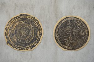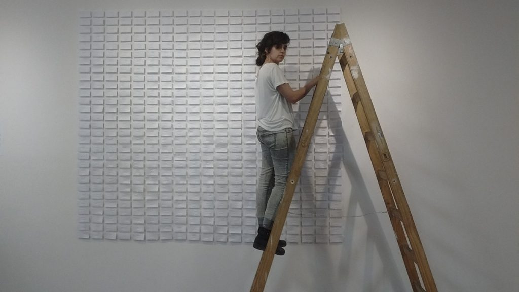 Otra de sus herramientas es la exploración, la investigación sobre un tema de su interés antes de producir: a raíz de esto nos cuenta sobre una obra que tiene expuesta en su taller: «La Lágrima». Se trata de una lágrima vista con un microscopio y un extracto de una instalación llamada «SOS» sobre el maltrato de género realizando con una técnica llamada gofrado.