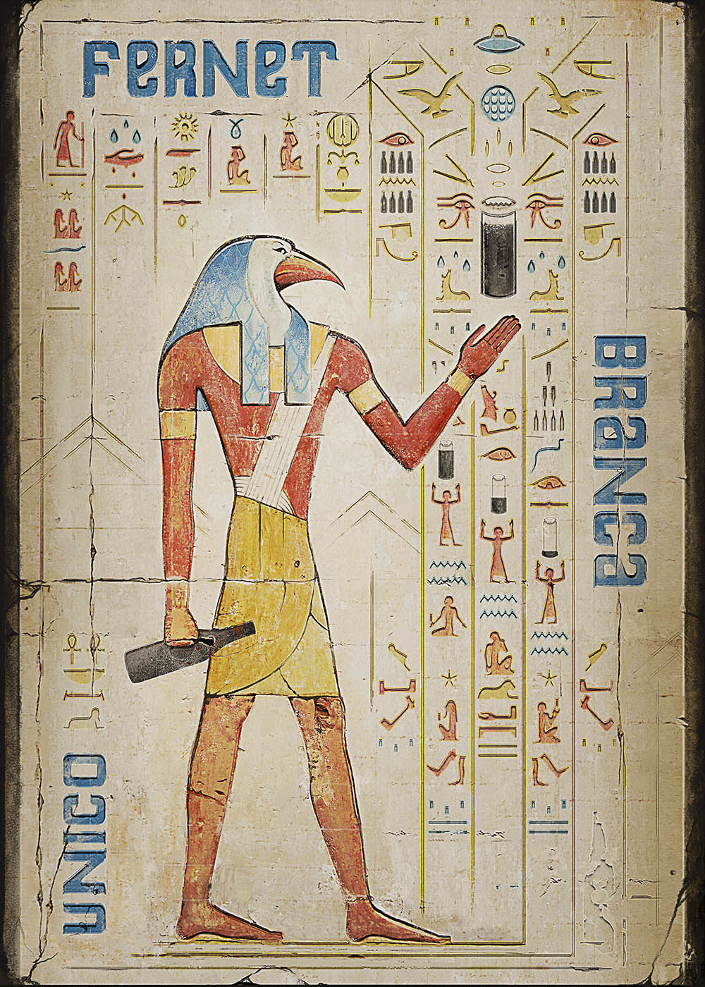 «Me pareció interesante utilizar símbolos como los jeroglíficos para relatar el proceso del fernet, que va desde la cosecha de especias, a la maceración, envasado y distribución. Desde el punto de vista gráfico pensé en dos lecturas: primero, las palabras de la marca junto al Dios Águila, y en segundo plano se puede ir descubriendo las simbologías egipcias como un arqueólogo dentro de una pirámide».