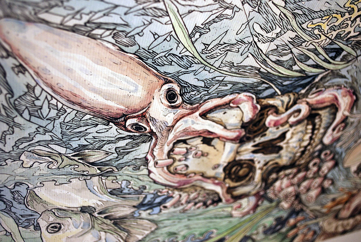 Sebastián es un gran hacedor de afiches y se inspira en el arte de Monet, Van Gogh, Basquiat, Dalí, de Katsushika Hokusai y también de artistas urbanos como Obey y Bansky. Utiliza desde lápices, fibrones, pinturas, aerosoles, diferentes tipos de papeles, collages, revistas viejas, imágenes de Internet, libros viejos de botánica, hasta fotografías…