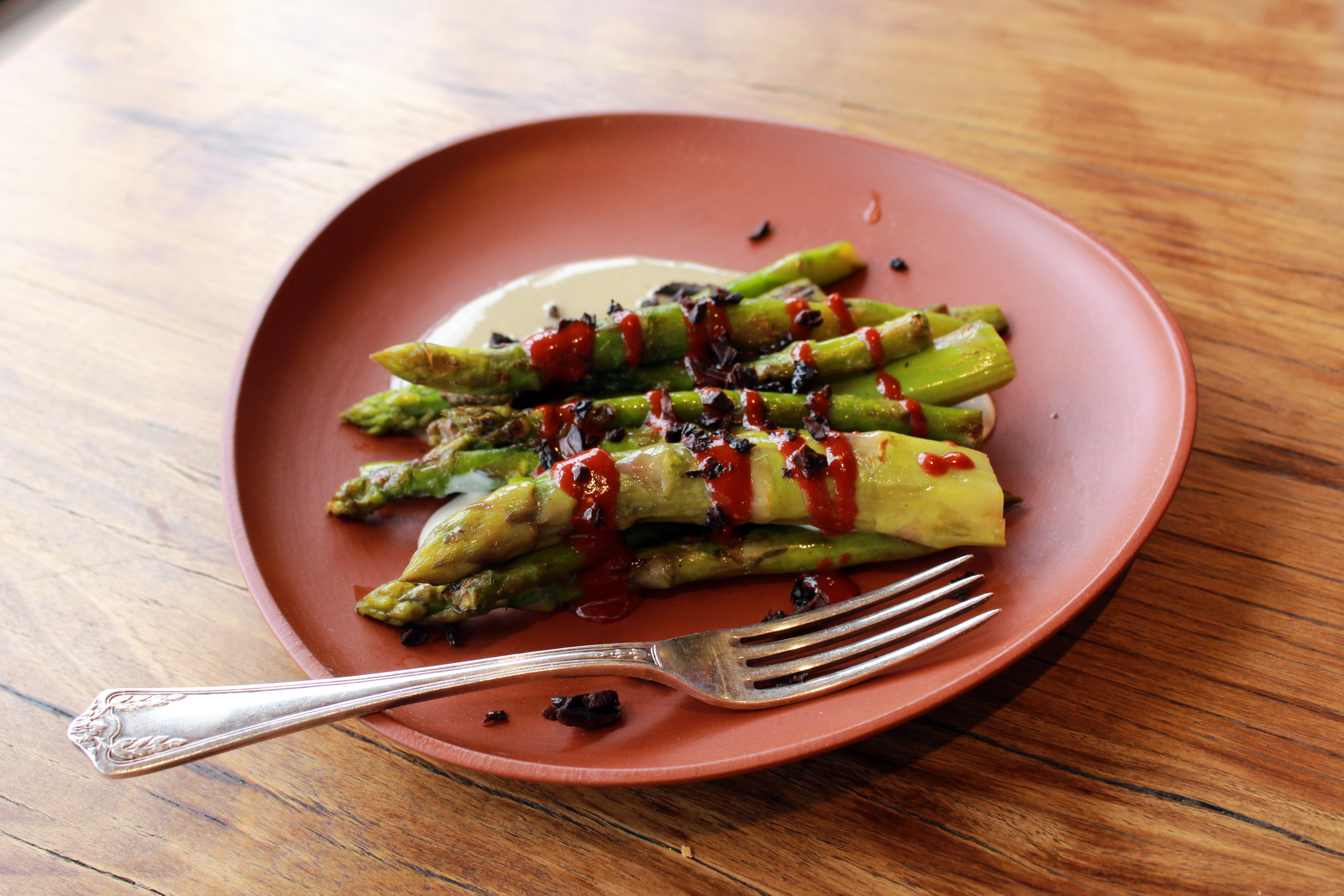 Finalmente el plato fuerte se hizo presente. Un popurrí de ensaladas con una amplia variedad de vegetales: Espárragos con tajín de sésamo blanco, yogur casero, salsa gochujang y sal de olivas negras. Ensalada fresca con 20 variedades de hojas verdes y flores con un exquisito vinagre de frutos rojos. Zanahorias glaseadas en azúcar negra y arvejas frescas. Mix de papines andinos con un aligot de papa, cúrcuma y salsa romesco de la casa a base de almendras.
