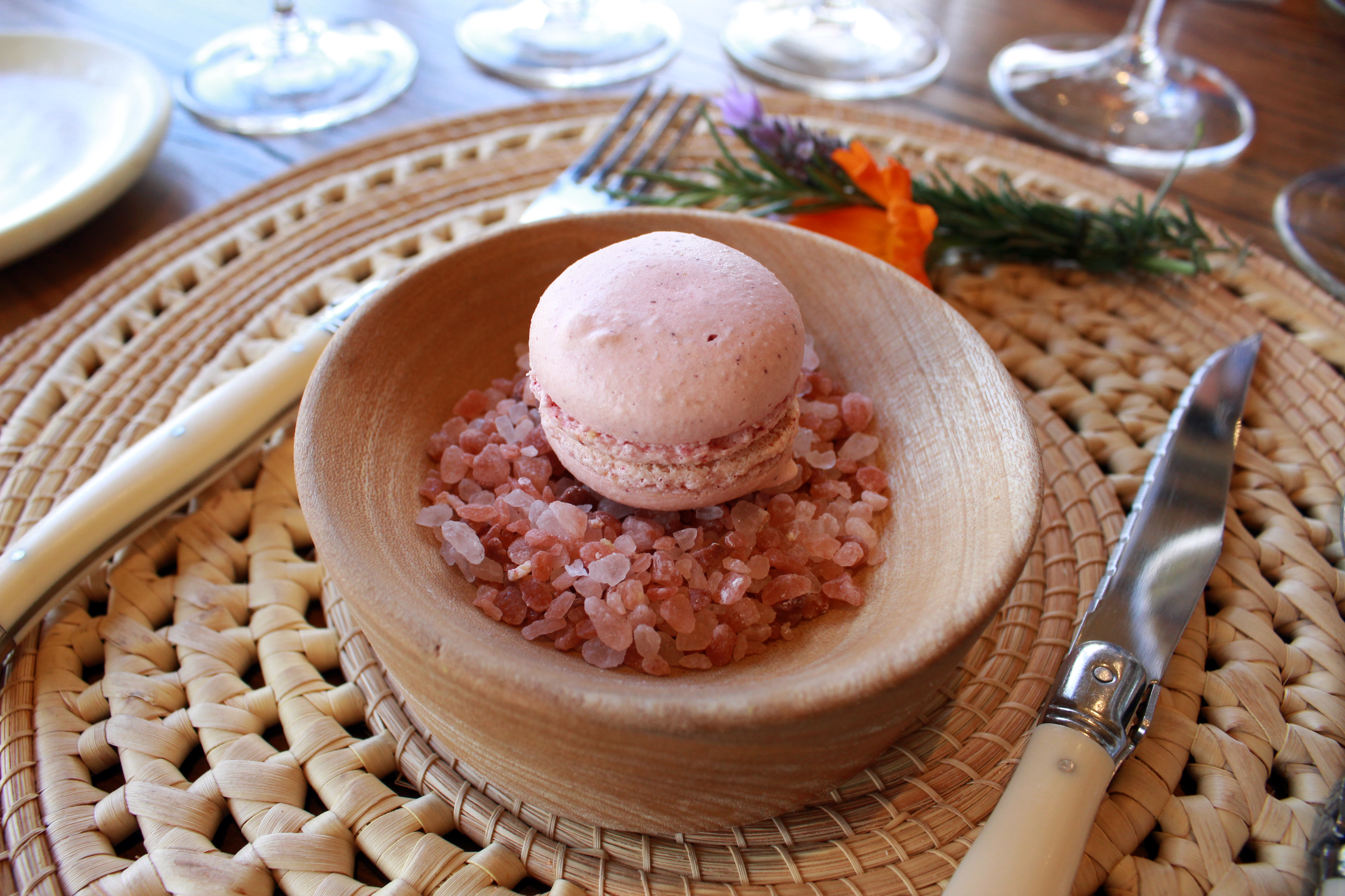 Finalmente en nuestra mesa, con una vista privilegiada a los viñedos de Lagarde, comenzamos con el primer paso de este gran almuerzo. Lo maridó un espumante Lagarde, un clásico blend 50% Chardonnay y 50% Pintor Noir. Ante nosotros se nos presentó un macarrón a base de hibiscus relleno de topinambur, un tubérculo de sabor similar a la papa, chocolate blanco y cardamomo. Sabores un tanto dulces en un primer paso fueron algo original, los detalles bellísimos y cuidados del emplatado son una característica a resaltar.