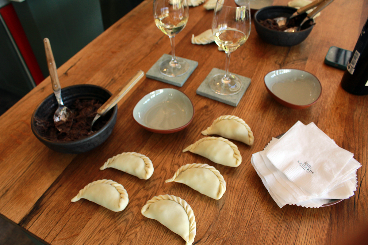 Dentro del salón, una mesa con una mise en place dispuesta para nosotros: masas de empanadas tipo criolla, relleno a base de morcilla y cebollas caramelizadas y como no podía faltar, el primer vino de la experiencia: un Sauvignon Blanc 2023 de la línea Lagarde, el corte más nuevo de la bodega. Tuvimos nuestra clase de repulgue de la mano de la Sous Chef. Un momento muy divertido e interactivo trabajando en la cocina de Zonda.